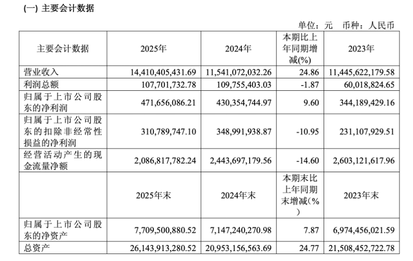 珠海冠宇2025年营收144.10亿元增24.86%,归母净利润4.72亿元增9.60%,手机电池营收增38.24%。