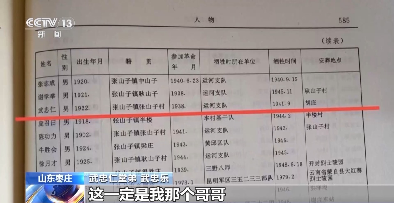 武忠仁堂弟 武忠乐:找了多少次没找到,我曾去枣庄烈士陵园查看,看名单里有没有他;之后又去了徐州、贾汪、阴平的烈士陵园,都没有找到,基本上那时候灰心了,看起来是找不到了。