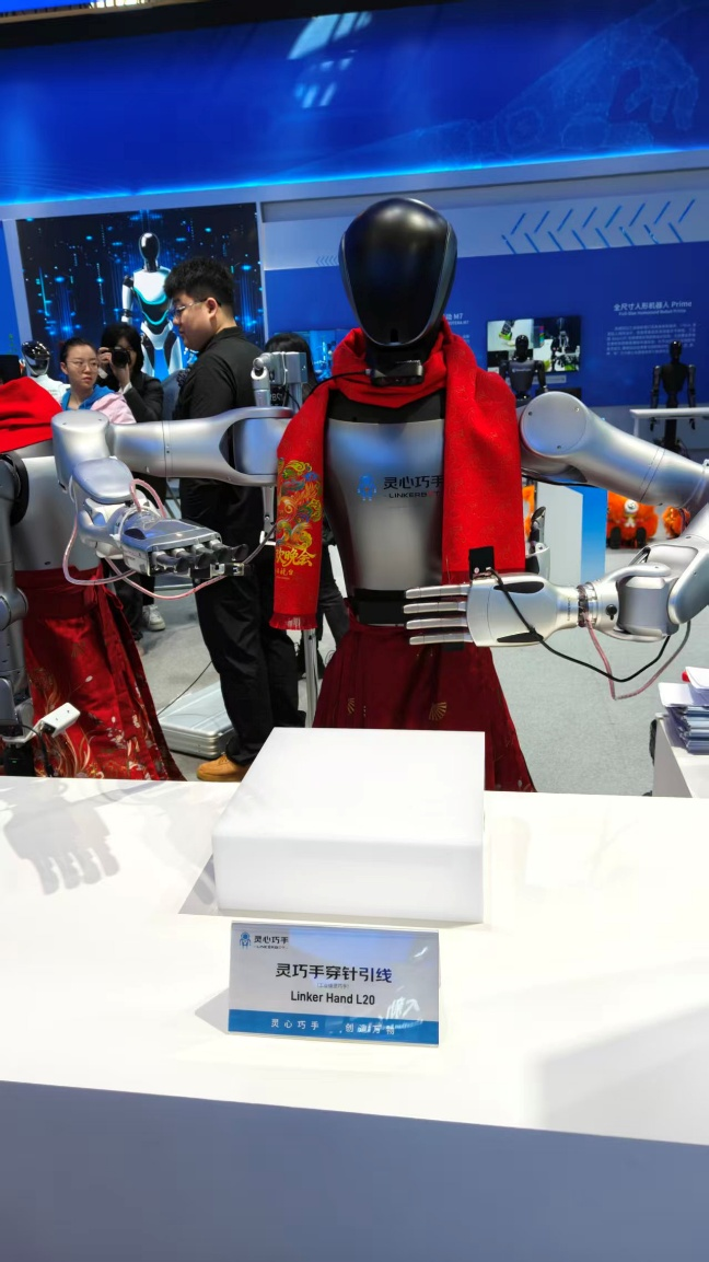 在具身智能展区,占据C位的是一双正在穿针引线的“灵巧手”,充分彰显了具身智能在复杂精细任务中的领先性能。工作人员告诉记者,“穿针引线是非常精细的活动,一改‘一个吸盘或者一个夹爪’的机械手的固有印象,它以更加灵活精细的动作将应用于具体的工业生产甚至是医疗场景中。通过这款产品,我们希望改变人形机器人只应用于舞台表演的固有认知,告诉人们实际上它也可以去生产,去创造。”