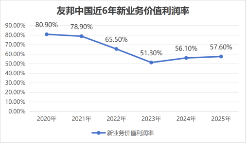 从新业务价值利润率来看,2025年相比2024年小幅回升,但仍处低位。自2020年起,该公司新业务价值率便持续下滑,2023年至谷底51.30%,较2022年同比下降18.2个百分点,较2019年最高点(93.5%)减少了超40个百分点。2024年回升至56.10%后,2025年微增至57.60%,较2024年同比上升1.5个百分点,但回升力度较弱。