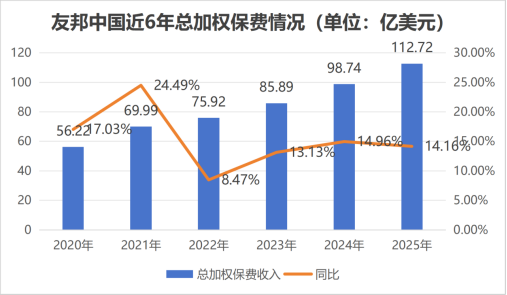 从承保端来看,友邦中国近年保持着年增10亿美元的节奏,2025年共实现总加权保费112.72亿美元,较2024年增长14.16%,金额规模增加13.98亿美元。近6年来看,该公司保费规模连年增长,与2020年相比翻倍。