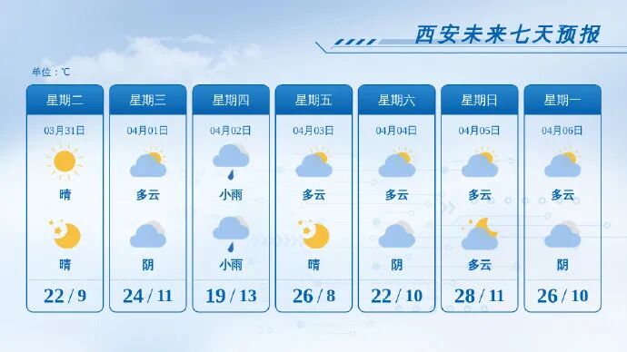 今明两天西安市以晴到多云天气为主,最高气温回升至23℃左右;4月2日将有一次弱降水过程,主要降水时段在2日夜间,量级以小雨为主,气温降至20℃以下。