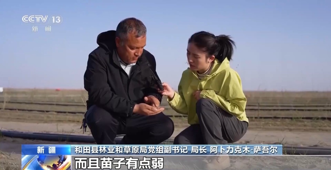 和田县林业和草原局党组副书记 局长 阿卜力克木·萨吾尔:苜蓿长得有点慢,而且苗子有点弱,菜籽长得快,给苜蓿起到遮阴的作用,如果苜蓿长得好,一亩地群众可以收入3000到4000块钱左右。