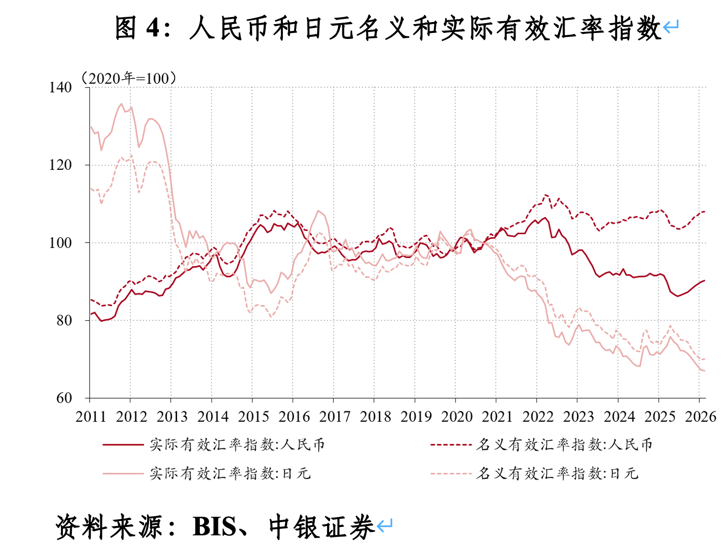 加大汇率重估的国际压力。近年来,中国出口增长强劲、进口持续疲软导致货物贸易顺差显著扩大,2025年贸易顺差突破万亿美元大关,2026年头两个月继续录得两位数的同比增长。与此同时,国际清算银行公布的人民币实际有效汇率指数总体延续了2022年4月以来的下降态势。与日元因名义汇率下降导致实际汇率走弱不同,中国实际汇率走弱主要缘于国内供强需弱、物价走势低迷。2022年4月至2025年6月,人民币实际有效汇率指数累计下降18.9%,人民币名义有效汇率指数仅下降7.7%。美以伊冲突影响下,如果全球通胀上行、国内通胀维持低位,国内外通胀差异扩大或导致人民币实际有效汇率重拾跌势,将给部分国家向我施压人民币汇率重估提供口实。