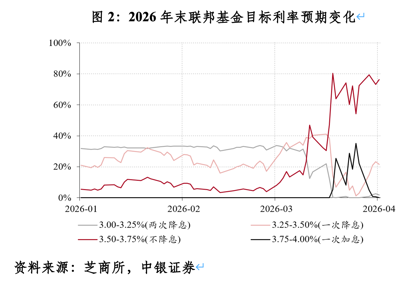 通胀威胁促使货币宽松预期退潮。美以伊冲突第三周(3月16日至20日),美联储、欧洲央行、英国央行和日本央行均按兵不动,并在货币政策立场上形成鹰派共识。市场对于美联储的关注焦点不再是“何时降息”,而是“能否降息”,对欧洲央行、英国央行的争论从关注“是否加息”转为审视“加息速度”,对日本央行则继续聚焦在“何时重启加息”上。芝商所美联储观察工具显示,截至4月2日,市场预期2026年美联储不降息概率较大。