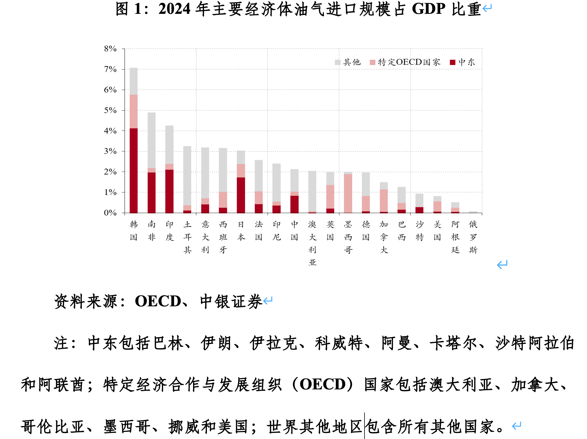 中国金融市场的相对韧性主要缘于中东局势紧张的非对称冲击。尽管中国是能源消费大国,但能源消费中油气占比较低,且油气进口依存度以及对中东油气的依赖程度远低于韩国等经济体。2024年,中国油气消费量占能源消费总量的比重为27%,煤炭、一次电力及其他能源消费占比分别为53.2%、19.8%。同期,中国油气进口总规模、自中东进口油气规模占GDP比重分别为2.1%、0.8%,而韩国、南非、印度和日本油气进口总规模占GDP比重分别为7%、4.9%、4.2%和3%,自中东进口油气规模占GDP比重分别为4.1%、2%、2.1%和1.7%。