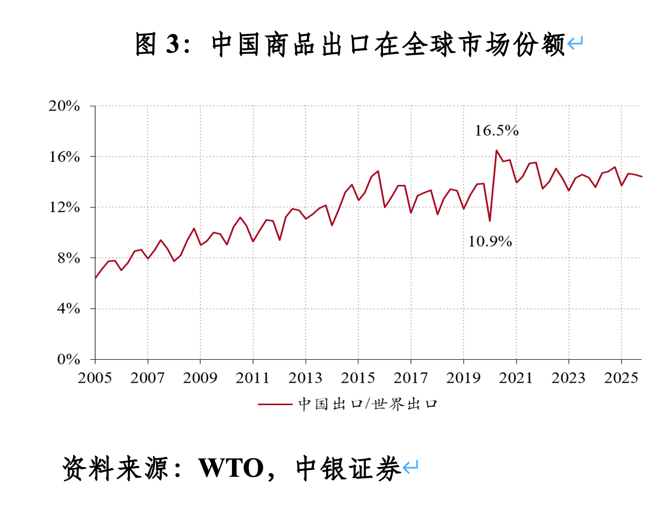 影响中国外需环境稳定。3月19日,世界贸易组织(WTO)发布最新报告指出,在不考虑能源价格冲击的基准情景下,预测全球商品贸易增速将从2025年的4.6%降至2026年的1.9%;如果油气价格在2026年全年持续高位运行,贸易增速预测值则下调0.5个百分点至1.4%。然而,这可能低估了美以伊冲突对于中国出口的影响。近年来,中国出口市场多元化取得积极进展,在对美出口份额下降的同时,增加了对亚洲和欧洲出口(2025年合计占比七成多)。美以伊冲突带来的冲击分布并不均衡,对中东能源依赖度较高的亚洲、欧洲等经济体首当其冲。WTO预测,在能源价格持续高企情景下,2026年欧洲、亚洲进口增速分别由上年的2.1%、6%降至0.3%、2.6%。与不考虑能源价格冲击的基准预测相比,这两个区域进口增速预测值分别下调1、0.7个百分点。有机构参考疫情期间的经验认为,在高油价冲击下,供应链重塑或促使订单向中国转移。但与疫情期间不同的是,美以伊冲突引发的高油价冲击具有全球性,中国或难以独善其身。预计订单转移对中国出口的提振作用有限,中国出口份额或仍将延续疫情以来的区间波动。